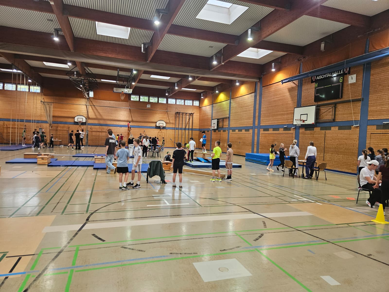 Am 17. Dezember fand in der Aischtalhalle das diesjährige Turnfest unserer Schule statt. Alle Schülerinnen und Schüler der fünften Klassen nahmen daran teil und wurden in zwei Gruppen eingeteilt, um die verschiedenen Stationen zu durchlaufen.