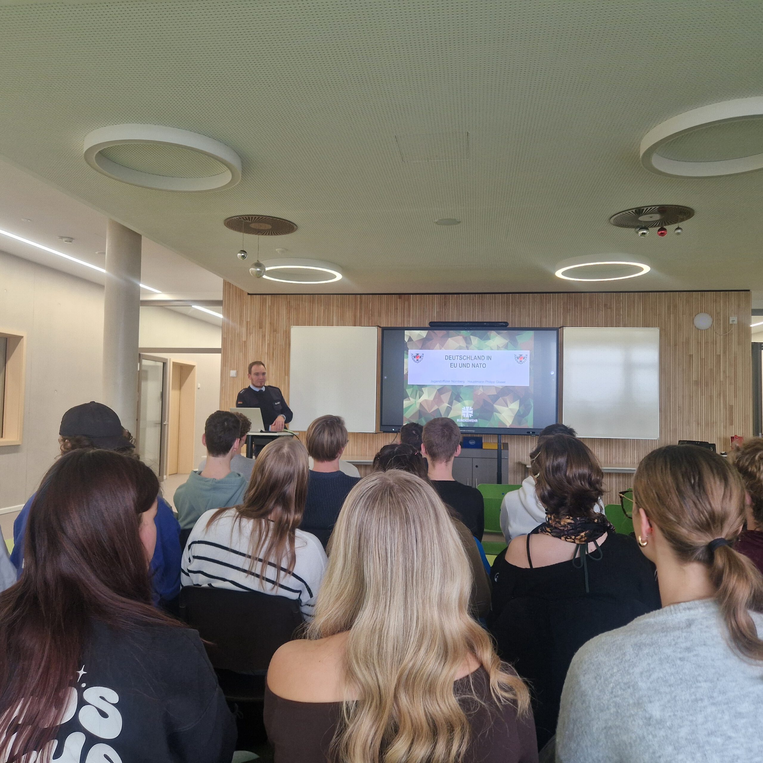 Im Rahmen der politischen Bildung besuchte am Dienstag, den 16.12.2025, der Jugendoffizier Philipp Glaser, der seit 2012 Soldat bei der Bundeswehr ist, den Politik-Leistungskurs von Frau Weberpals sowie den Grundkurs von Frau Ortegel-Kropf der Q12 an unserer Schule. Herr Glaser ist für den Raum Mittelfranken zuständig und gehört zu einem bundesweiten Netzwerk von 94 Jugendoffizieren, die sicherheitspolitische Themen an Schulen vermitteln. Dabei betonte er ausdrücklich, dass es sich nicht um Nachwuchswerbung handelt, sondern um sachliche Informationsarbeit, die den Dialog fördern und bestehende Vorurteile ausräumen soll. In seinem Vortrag ging Herr Glaser auf die aktuelle sicherheitspolitische Lage ein und thematisierte insbesondere die Bedeutung von Demokratie in der internationalen Politik. Er erläuterte, dass nur ein kleiner Teil der Weltbevölkerung in einer vollständigen Demokratie lebt – anders, als es viele der Schülerinnen und Schüler zuvor geglaubt hatten. Einen weiteren Schwerpunkt bildete der Ukrainekrieg, den er als derzeit größte sicherheitspolitische Herausforderung für Europa bezeichnete. Im weiteren Verlauf erläuterte Herr Glaser den Auftrag der Bundeswehr, der in der Landes- und Bündnisverteidigung liegt, sowie die Rolle internationaler Organisationen wie der NATO, der Vereinten Nationen und der Europäischen Union. Besonders die NATO wurde als zentrales Bündnis für die Sicherheit Europas hervorgehoben, das sich vor allem durch die USA als Mitgliedsstaat von den anderen Organisationen abhebt. Der Vortrag wurde von den Anwesenden als sehr informativ und gelungen wahrgenommen. Der Nachmittag endete mit einer offenen Diskussionsrunde, in der die Schülerinnen und Schüler die Möglichkeit hatten, ihre Fragen zu stellen.